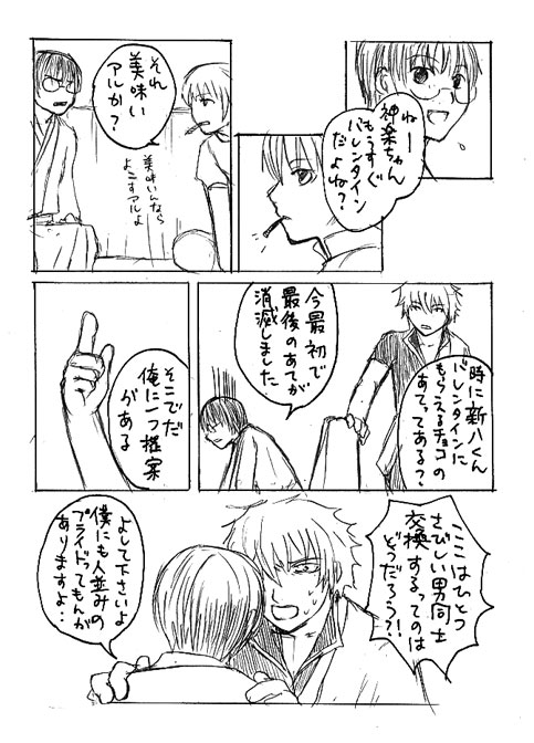 本誌では是非こういう往生際の悪い事をして欲しい でも神楽ちゃんは銀ちゃんにはあげるんでないかと思う 新八もお妙さんからは貰えるんじゃないかと そんでものすごい低次元の個数で二人で競えばいいよ! そういう銀新大好き!キャッキャ ※「大江戸セックスドラッグロクンロール」より使い回し HARUに出ます。